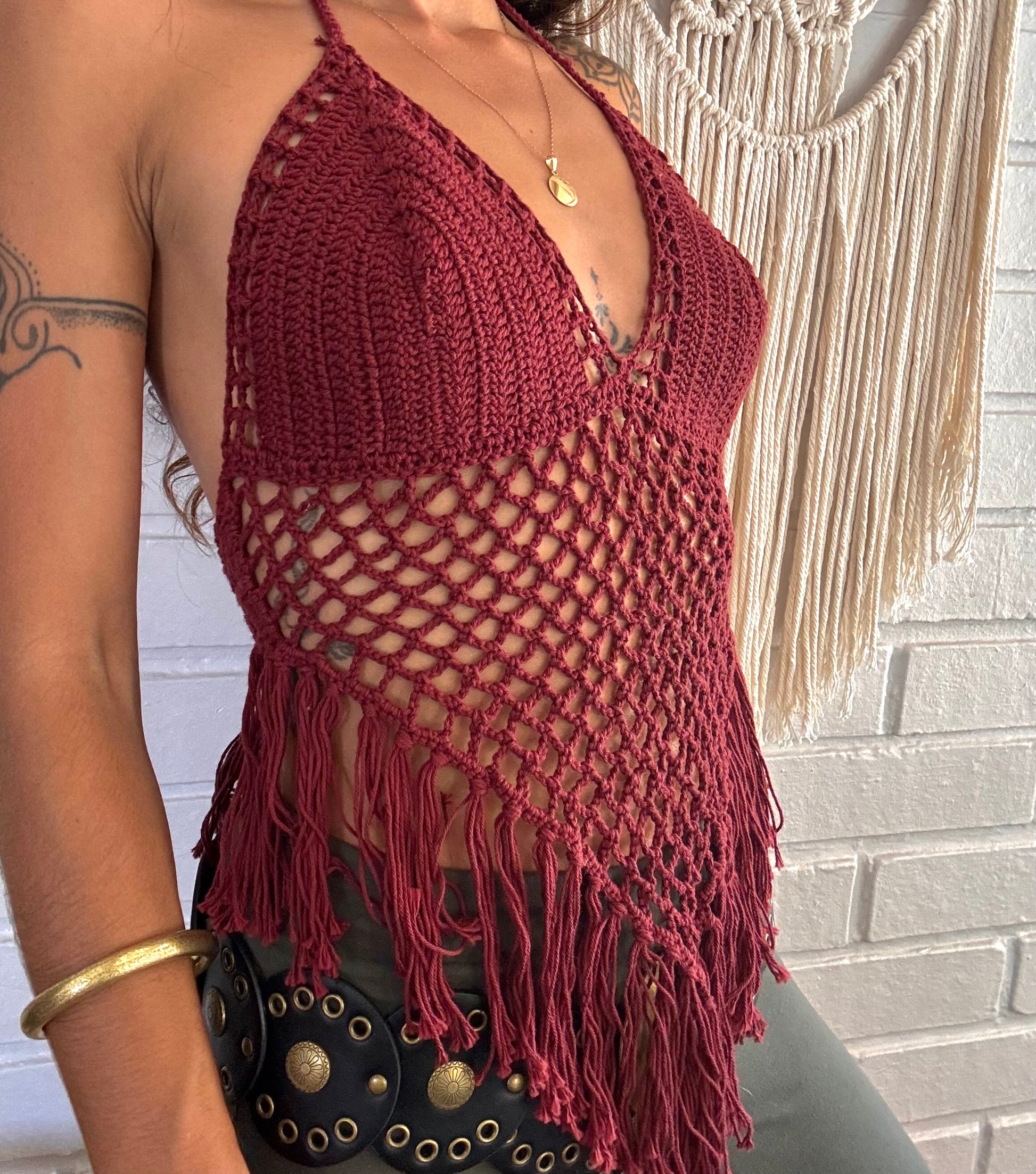 Top gypsy color burdeo, ajustable al cuello y la espalda acomodándose a tu propio cuerpo. Tiene detalle calado lo que lo hace fresco y sus flecos le dan todo el toque boho chic que esta en tendencia. Hecho a mano con hilo 100% de algodón.