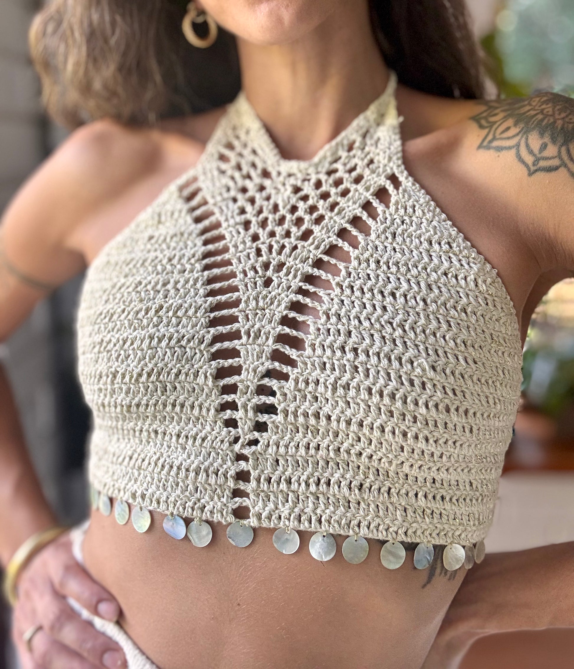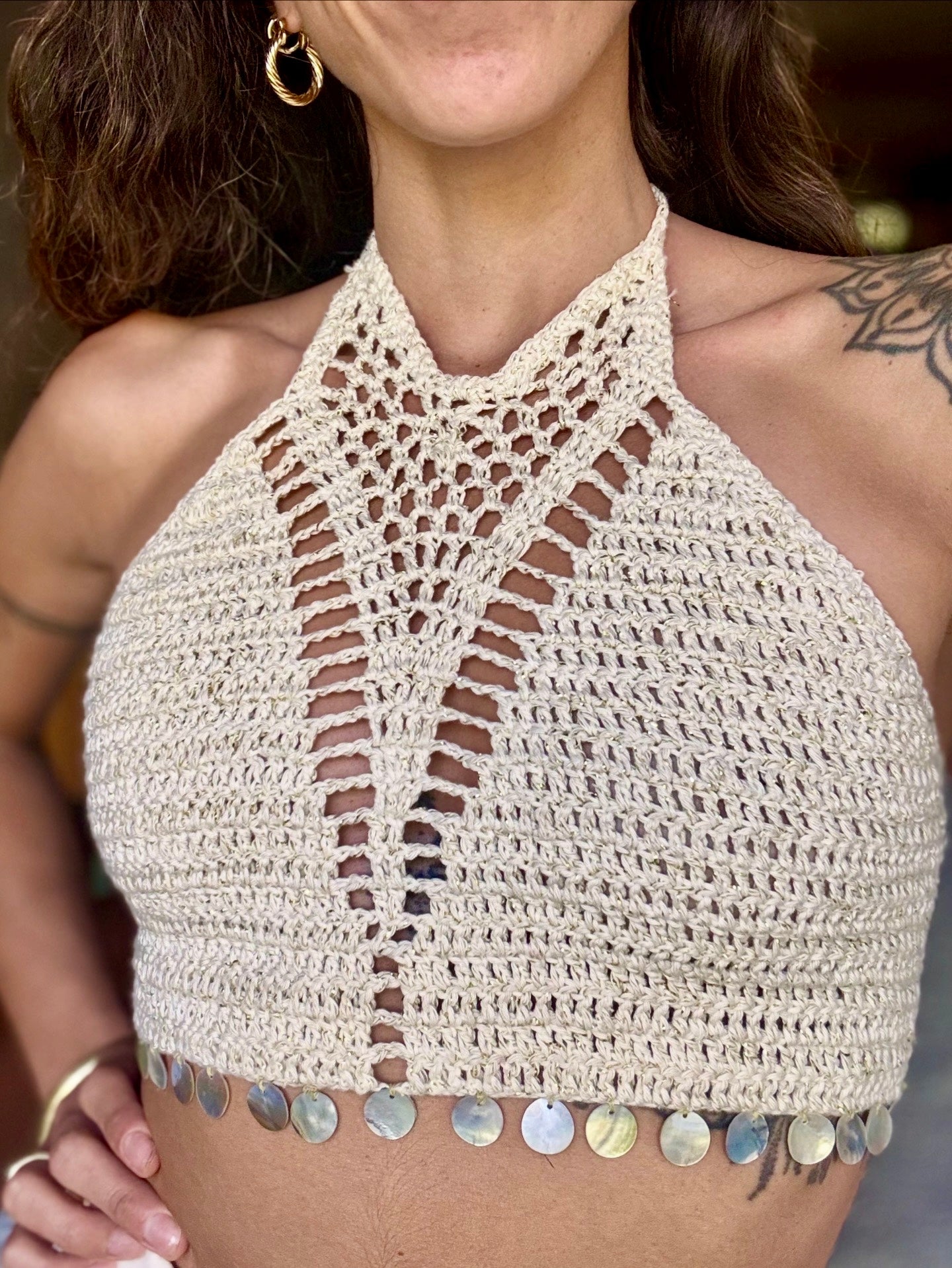 Top blanco dorado con aplicaciones en nacar. Ajustable al cuello y en la espalda.